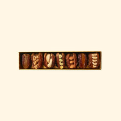 A selection of luxurious Saqai and khudri dates filled with nuts in a gift box.